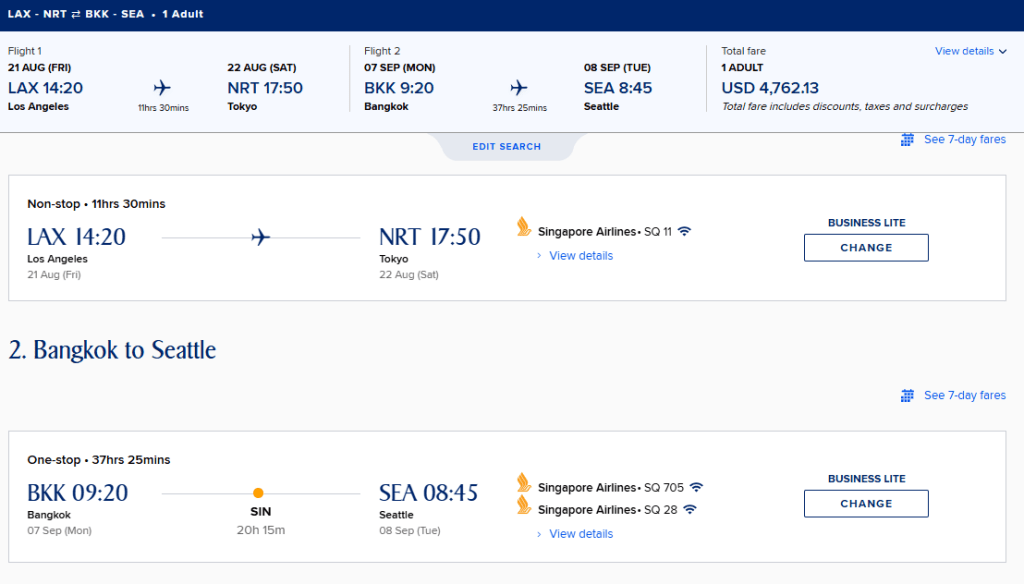 Notes – flying back SIN-SEA is actually more expensive than flying BKK-SIN-SEA buy over $600 in business class and has 1 less flight.