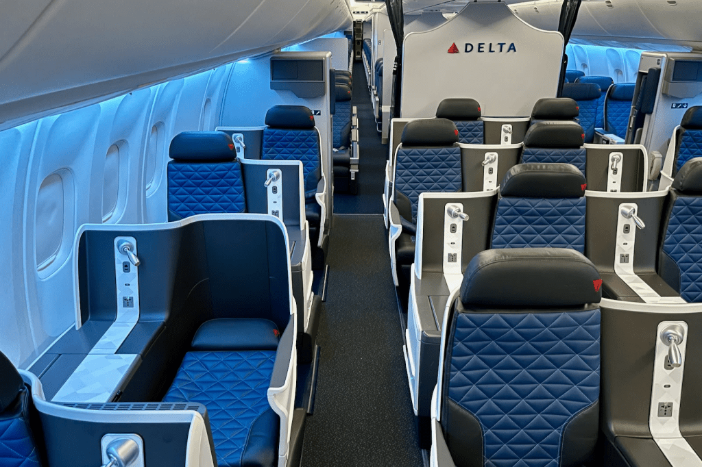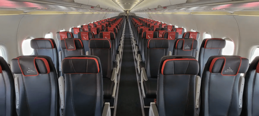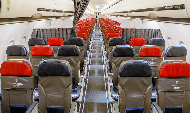2-2-2 seating plan across with 19″ compared to 2-3-2 in economy with 18″ seat